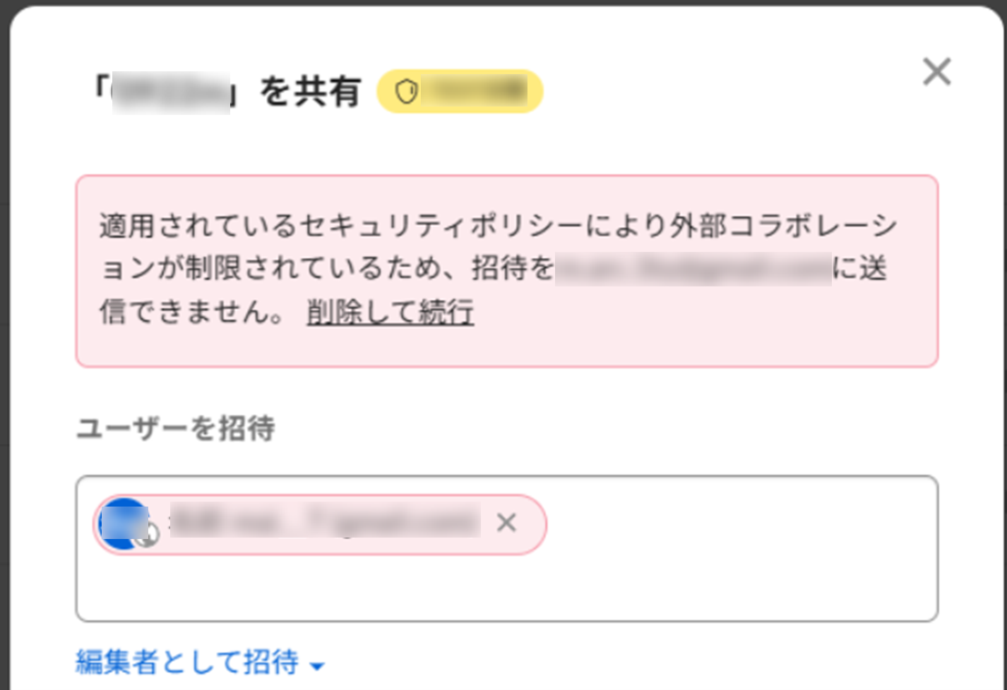 「適用されているセキュリティポリシーにより外部コラボレーションが制限されているため、招待を(メールアドレス)に送信できません」