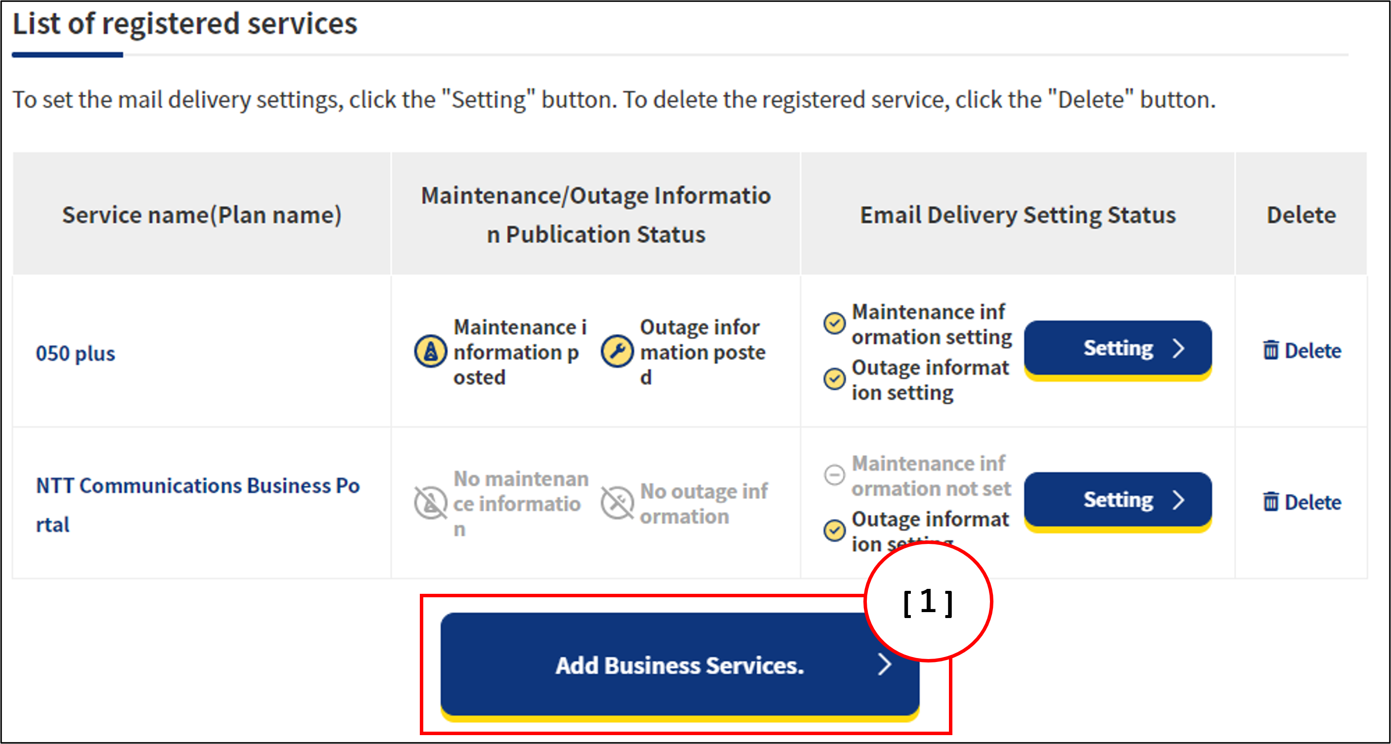 Click the Add Service button from "Individual Customer Service" or "Corporate Customer Service" of the Maintenance / Outages notice service.