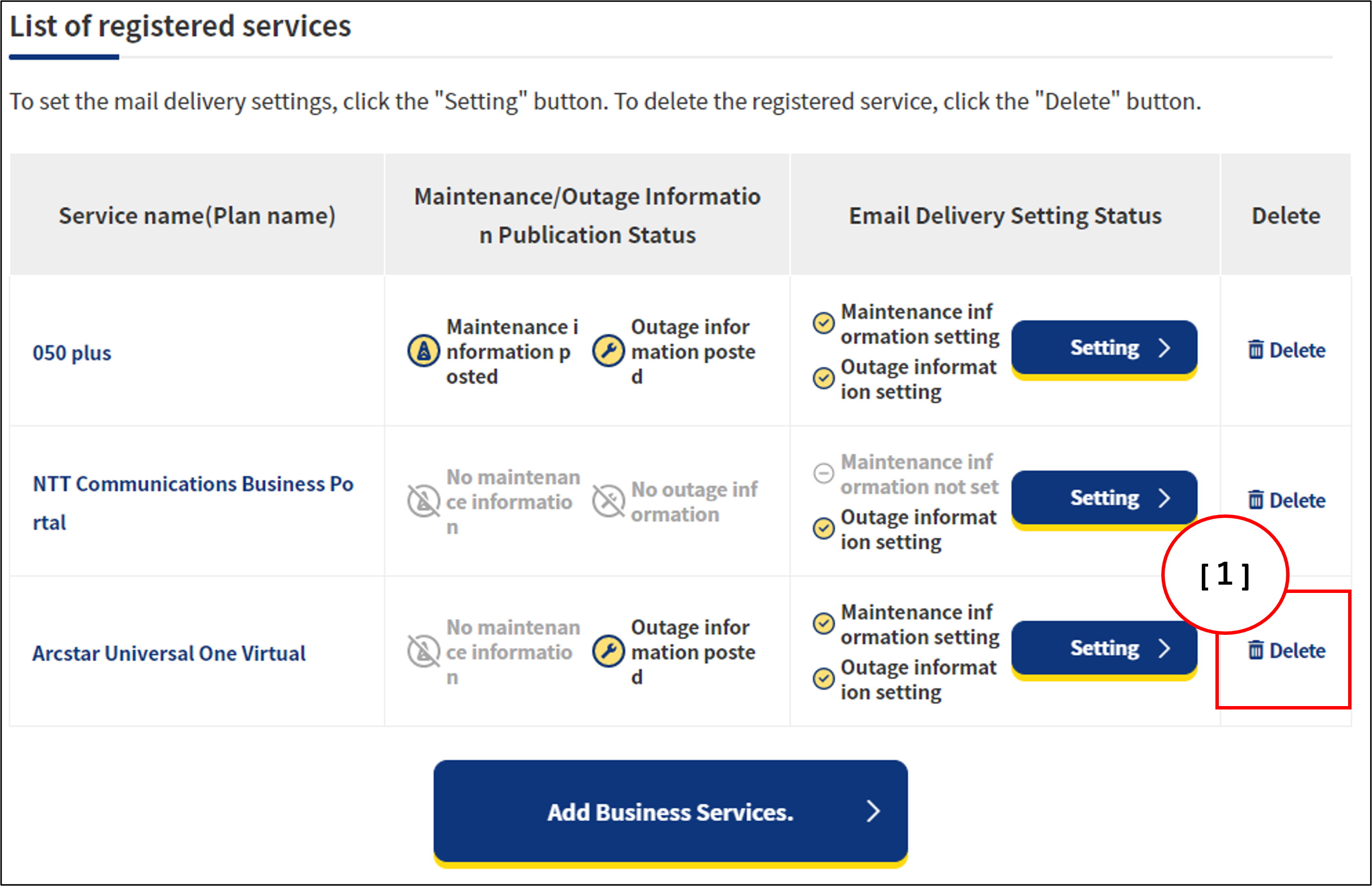 The registered services are listed on the top of the Maintenance / Outages notice service, and you can quickly access the support page of each service and check the posting status of maintenance / failure information.